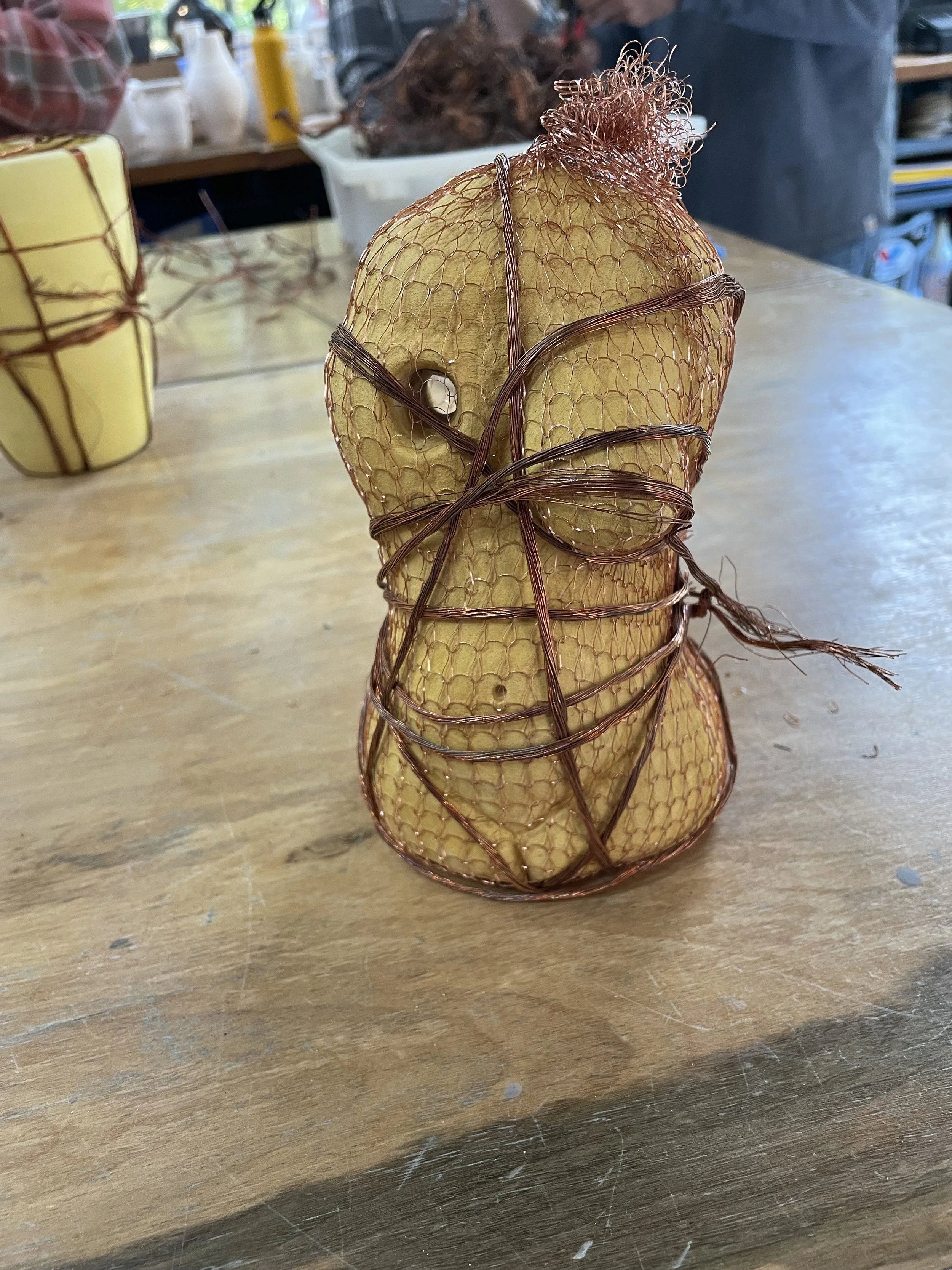 This sculpture is inspired by my wife Barb, a breast cancer survivor. It was fired Raku-style outdoors in Connecticut. The copper gives it those unique colors. You can see it before it was fired and then the effects of the copper wire. It’s approximately 6 inches tall.